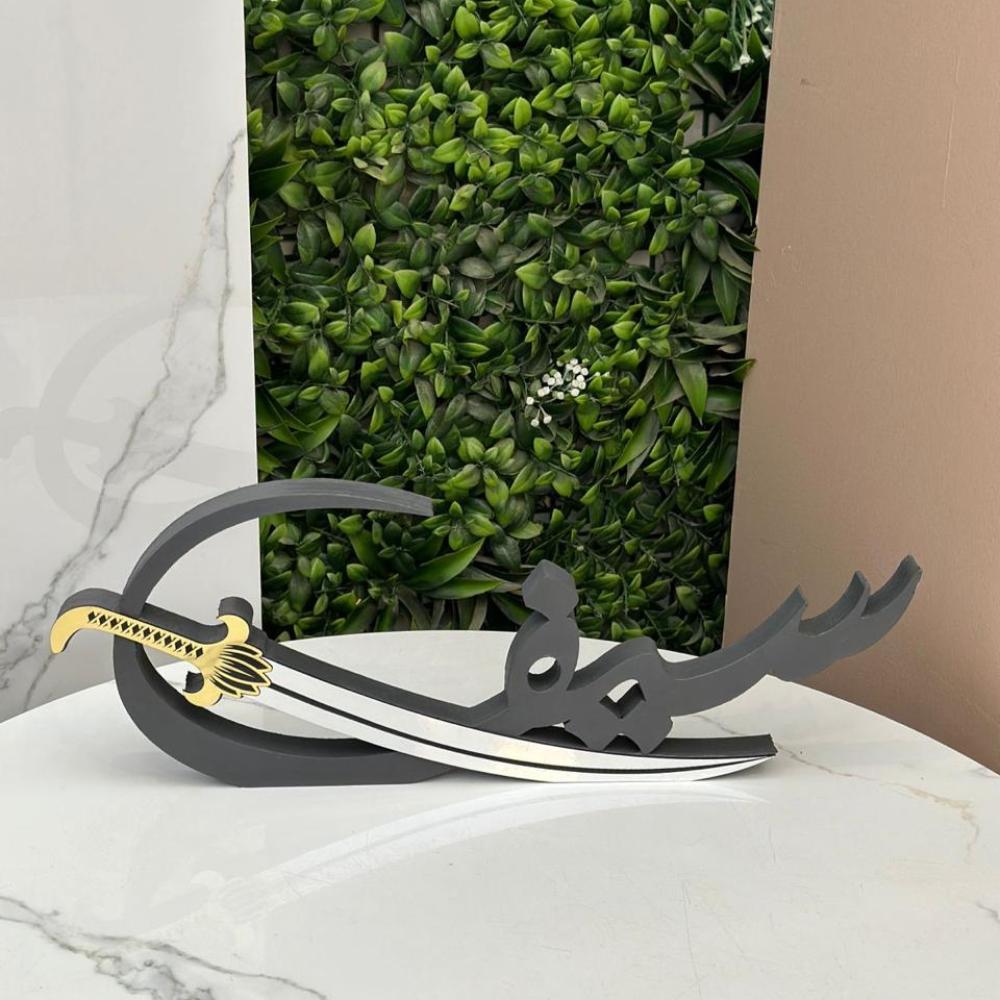 - الاسم مصنوع من الخشب والفبر الذهبي والفضي للسيف